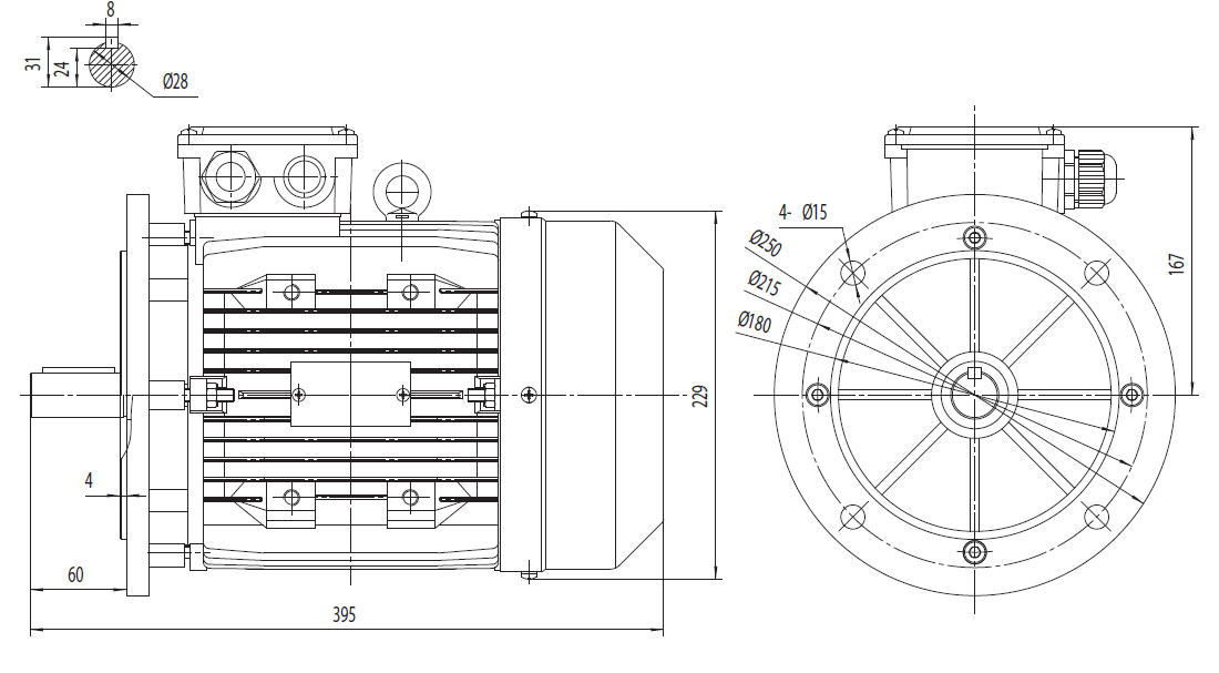 Flexibilitatea instalării este asigurată prin disponibilitatea tuturor variantelor de fixare pentru gama de motor trifazat 4kW 1400rpm ax 28mm IEC 112: